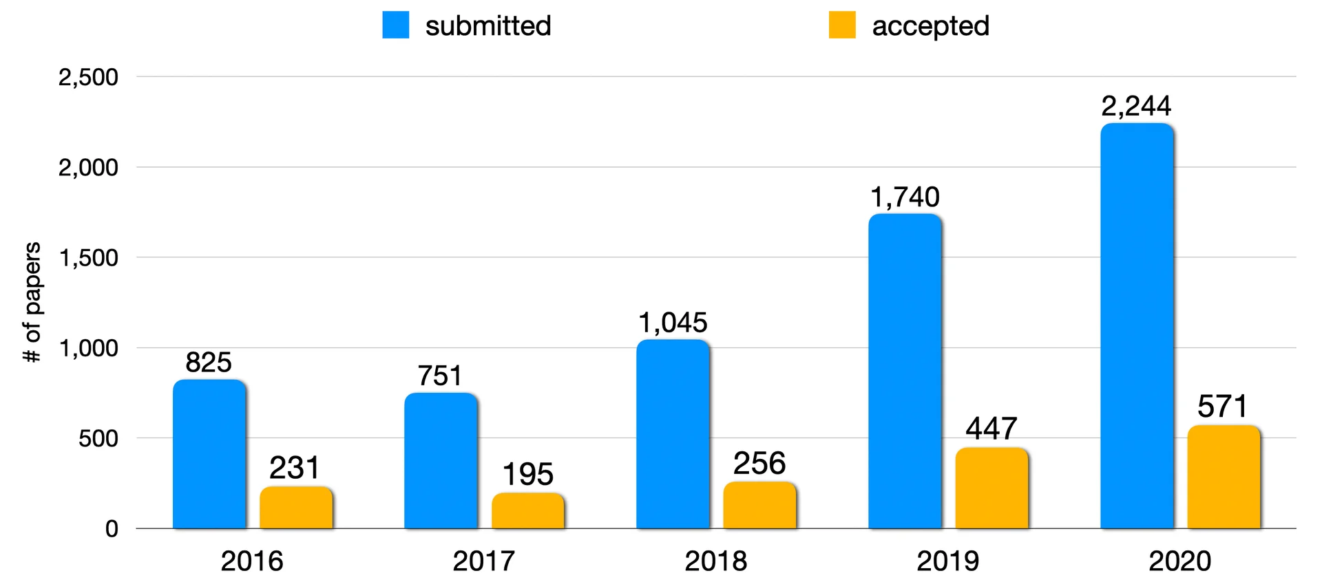 금년도에 제출된 논문 수는 최초로 2000편을 넘긴 2244편이었으며, 이는 2016년에 비해서는 약 2.7배 증가한 수치입니다. 작년에 비해서는 약 29% 증가하였는데, 제출되는 논문의 수가 꾸준히 증가하고 있는 것을 보며 NLP 분야의 관심도가 날이 갈수록 높아짐을 체감할 수 있었습니다. Acceptance Rate는 작년이 25.68%, 올해는 25.44% 으로 작년과 거의 동일한 비율을 유지하였습니다. EMNLP 역시 약 25% 정도의 Acceptance Rate 유지하면서, 두 학회 모두 퀄리티를 보장하기 위해서 엄격한 심사 기준을 유지하고 있음을 알 수 있습니다.