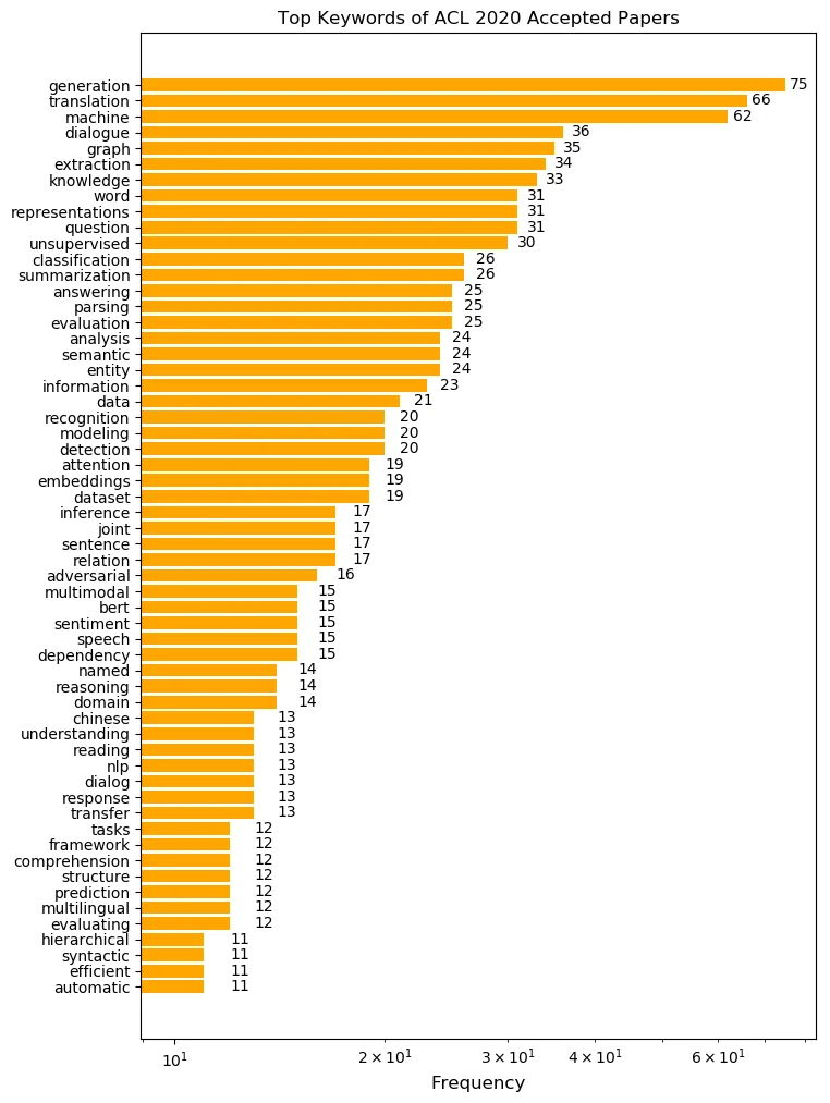 가장 많이 사용된 키워드는 ‘Generation’ (생성)입니다. EMNLP-IJCNLP 2019 프리뷰에서 키워드 분석을 진행해 보았을 때와 동일하게 1위를 차지했는데요, 특히 다른 키워드에 비해서 압도적으로 빈도가 높다는 점도 주목해 볼만 합니다. 최근의 GPT-3나 Meena 등 파라미터가 엄청나게 많은 Transformer 계열들이 괄목할만한 성능을 보여주고 있는데, 이런 추세를 반영하듯 많은 연구자들이 기존에 하지 못했던 생성과 관련된 연구에 집중하고 있는 것을 알 수 있습니다.