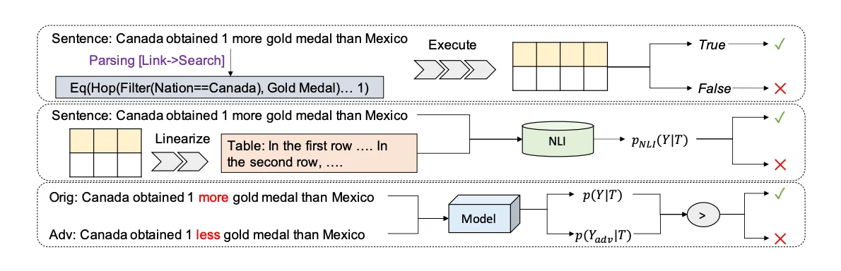 기존의 IE 기반 Evaluation은 한계가 있으므로, Parsing 기반 방법(문장의 결과를 다시 Parsing해서 원 데이터 Table과 일치하는지 확인하기), NLI 기반 방법(주어진 테이블과 모순된 문장인지 확인하기)과 Adversarial Method 기반 Auto Evaluation 방법(일부 단어를 반대로 바꾼 후, 원 문장과 비교하기)을 새로 제안하였습니다.