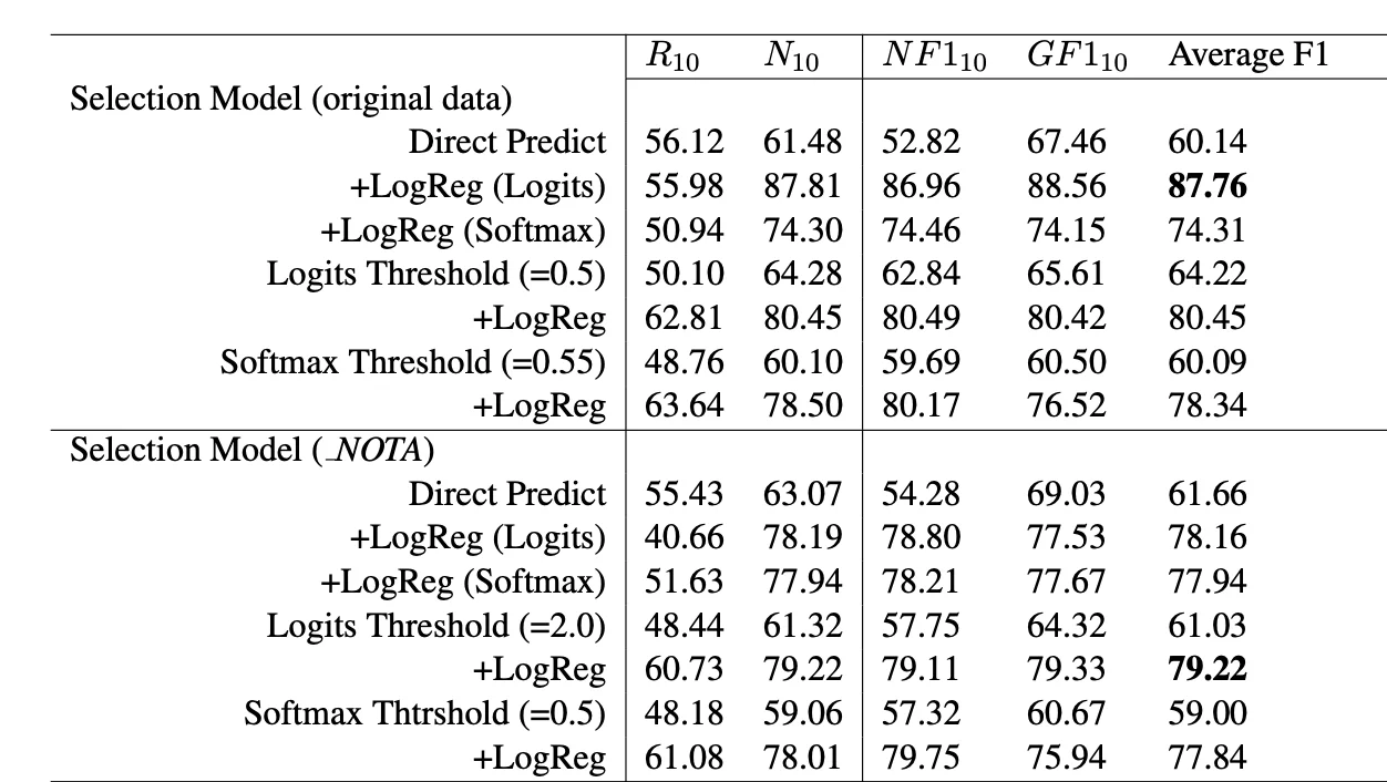 이를 검증하기 위해 Ubuntu Dialog Corpus로 응답 선택기를 훈련하여, 임의의 정답을 NOTA로 치환한 후 그 결과를 확인하였습니다. 실험 결과 Logistic Regression Layer를 둔 방법이 가장 NOTA를 잘 검출하는 것으로 확인되었습니다.