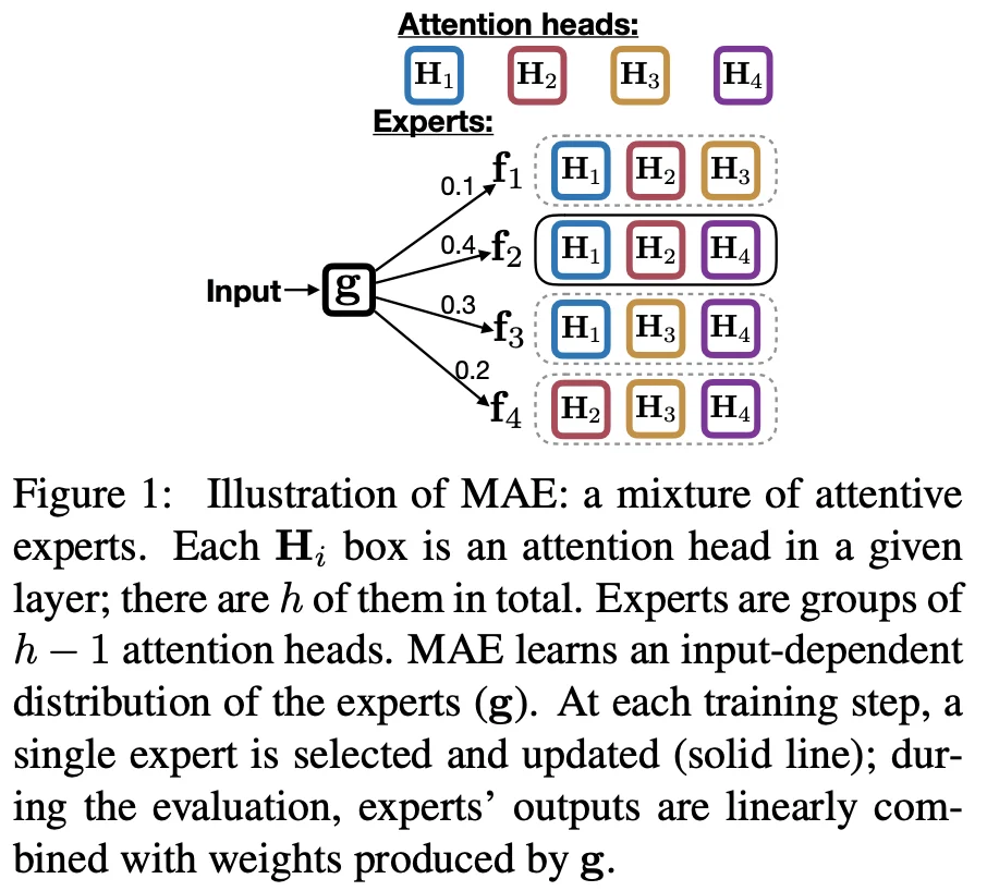 저자는 pruning 대신 입력에 따라 활성화 할 헤드를 모델이 직접 배워서 선택하는 방법을 제안하고 이를 mixture of experts (MoE)와 접목시켜 mixture of attentive experts (MAE)라 명명합니다.