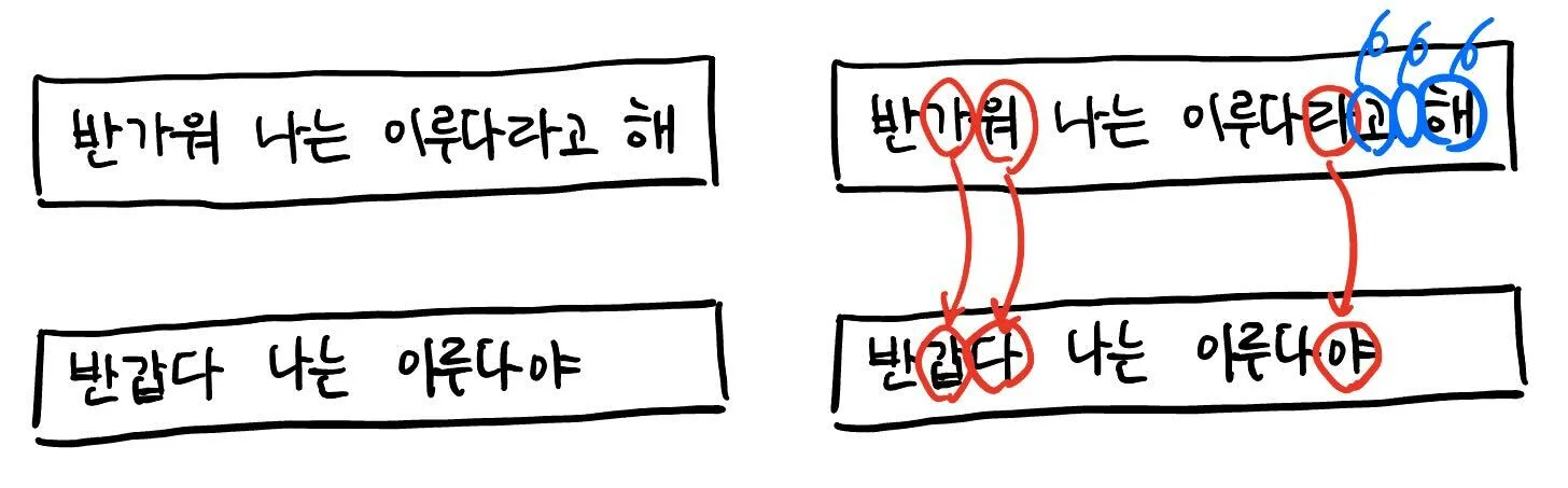 삽입은 그냥 내가 원하는 글자를 한 쪽 문서에 추가하는 행위이고 삭제는 말 그대로 글자를 삭제하는 것, 치환은 글자를 원하는 글자로 바꾸는 행위입니다. 더 쉬운 이해를 위해서 간단한 예시를 같이 알아보겠습니다.