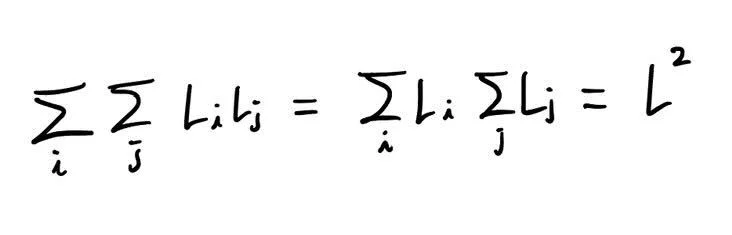 (수식 주의: 아래의 식은 모든 문서 쌍마다 문서 길이의 곱만큼 연산량이 필요하다면 전체 연산량은 문서 총 길이의 제곱임을 보여주는 식입니다.)