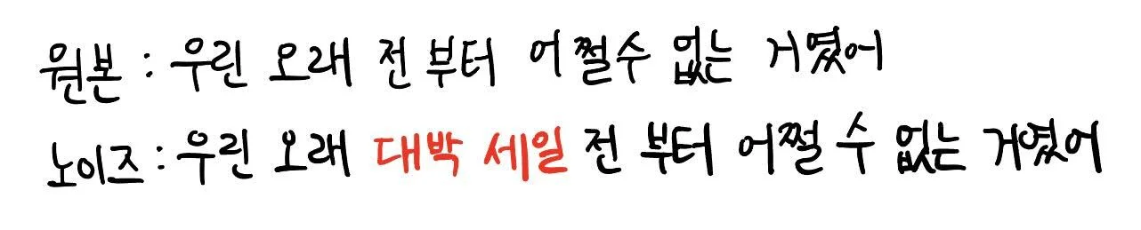 왜 더 긴 문서를 날리냐고요? 저희의 데이터들에서 중복인 케이스들을 살펴보면 아래의 예시처럼 문서의 중간중간에 광고 문구 같은 노이즈가 추가된 케이스가 대부분이었습니다. 따라서 이런 케이스들을 손쉽게 다루기 위해 그냥 중복인 문서들의 그룹에서 가장 짧은 문서만 살아남도록 하는 알고리즘을 구성하게 되었습니다.