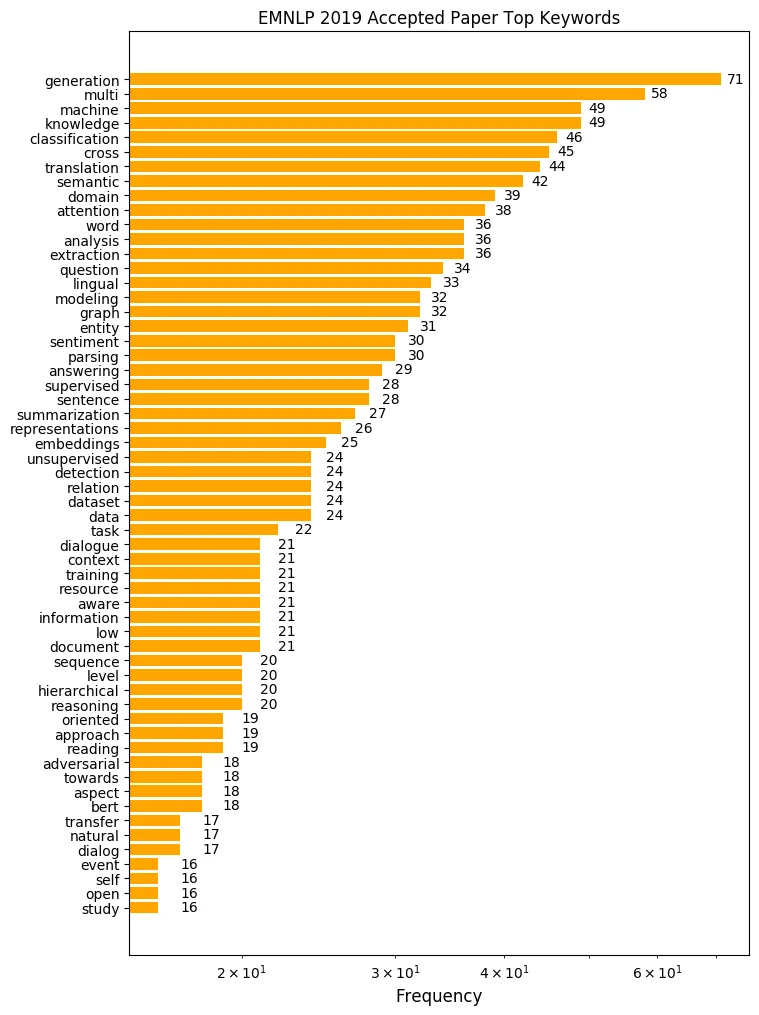 제일 많이 사용된 단어는 “generation”입니다. 무려 71회나 쓰였네요. 많은 NLP 태스크가 text-to-text 형식을 띠고 있기 때문에, 문장을 잘 생성하는 것은 근본적으로 중요합니다. 컴퓨터 비전 분야에서 GAN, VAE 등의 생성 모델이 우수한 성과를 거둔 것에 힘입어 NLP 분야에서도 문장 생성에 관한 연구가 활발히 진행되고 있습니다. AI가 얼마나 괜찮은 문장을 만들어 내는지, 연구자들이 현재 text generation에서 어떤 문제에 주목하고 있는지 체크해보는 것도 중요하겠네요.