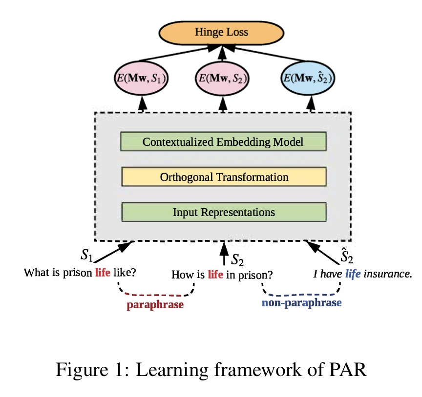 본 논문에서는 외부 지식을 임베딩에 투영하는 기법인 재구성법(retrofitting)을 활용하여 바꿔쓰기한 문맥에 강인한(robust) 임베딩을 향상하는 법을 제시합니다. 어떤 문장이 주어졌을 때, 이 문장을 바꿔쓰기한 문장과 그렇지 않은 문장에 대한 hinge loss를 이용하여 훈련시킵니다.