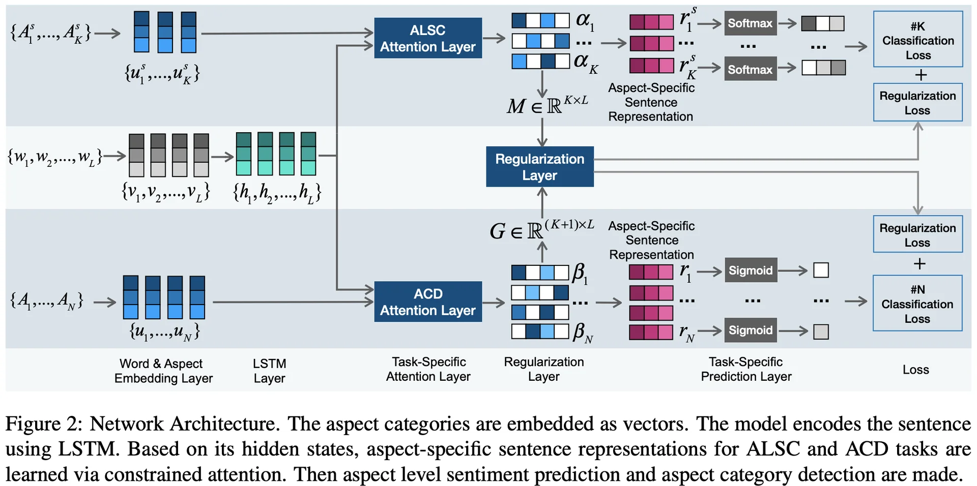 이를 막기 위해 본 논문에서는 Constrained Attention Network (CAN)를 제시합니다. 이 구조에서 aspect level sentiment classification (ALSC)과 aspect category detection (ACD)을 제안했습니다. 위 두 보조태스크는 서로에 대해 regularization 효과를 지닙니다. 본 논문에서는 서로 다른 두 보조태스크에 대해서 orthogonal regularization loss를 적용하였습니다.