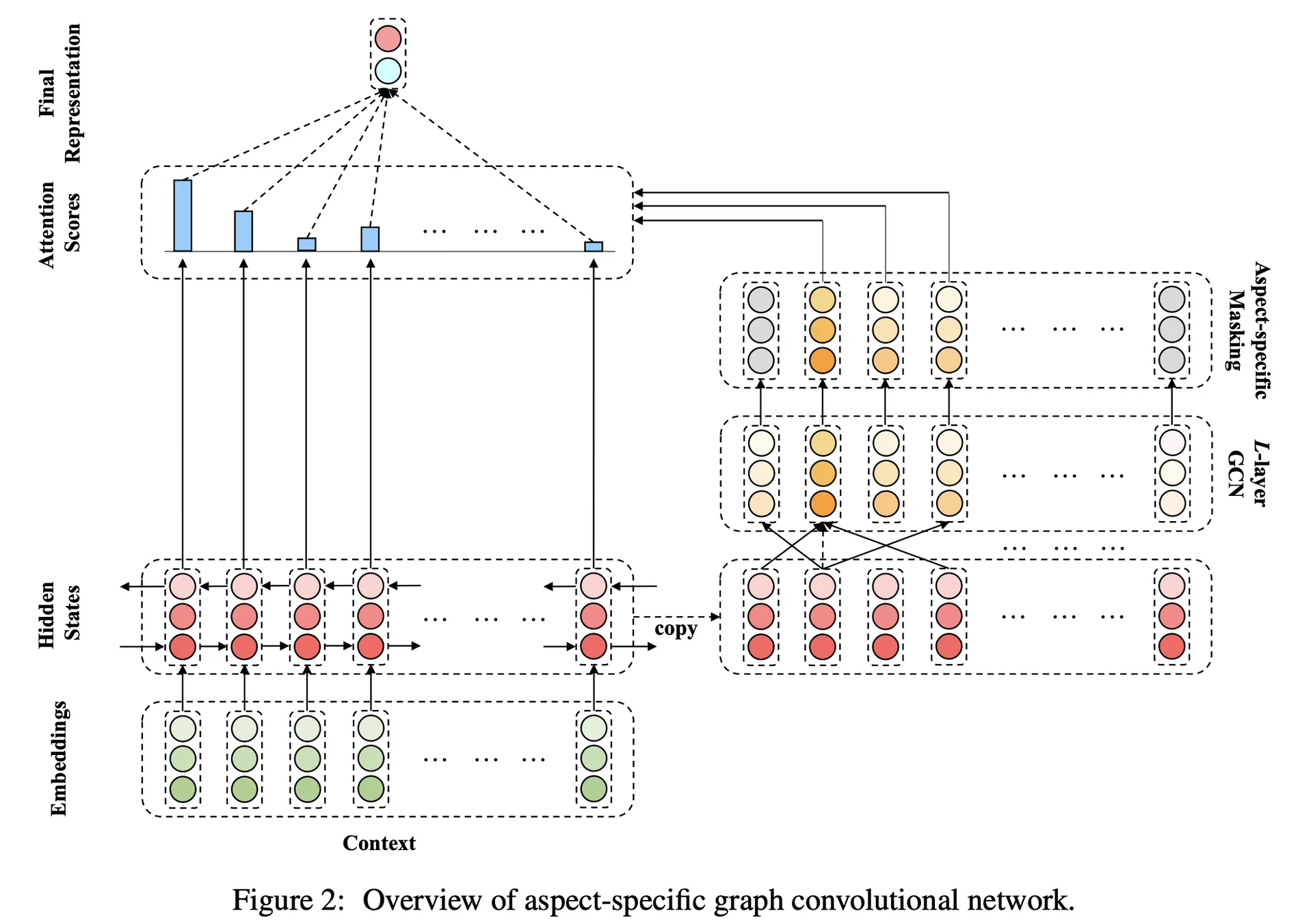 이러한 문제를 해결하기 위해 본 논문에서는 Graph Convolutional Network (GCN) 기반의 모델을 제안합니다. 먼저 GCN과 aspect-specific masking을 통해 aspect representation을 만들고 이를 LSTM으로 만든 문장 representation과 어텐션을 하여 최종 분류를 합니다.