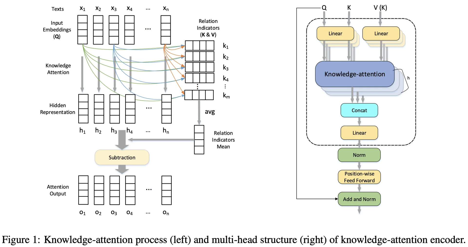 본 논문에서는 외부 어휘 리소스(FrameNet, Thesaurus.com)로부터 얻은 사전 지식(prior knowledge)을 포괄하는 knowledge-attention 인코더를 제안합니다. Knowledge-attention 인코더는 어휘 리소스로부터 관계 지표(relation indicator)를 뽑아내고 이것과 입력 문장 간의 key-value 어텐션을 통해 hidden representation을 만듭니다.