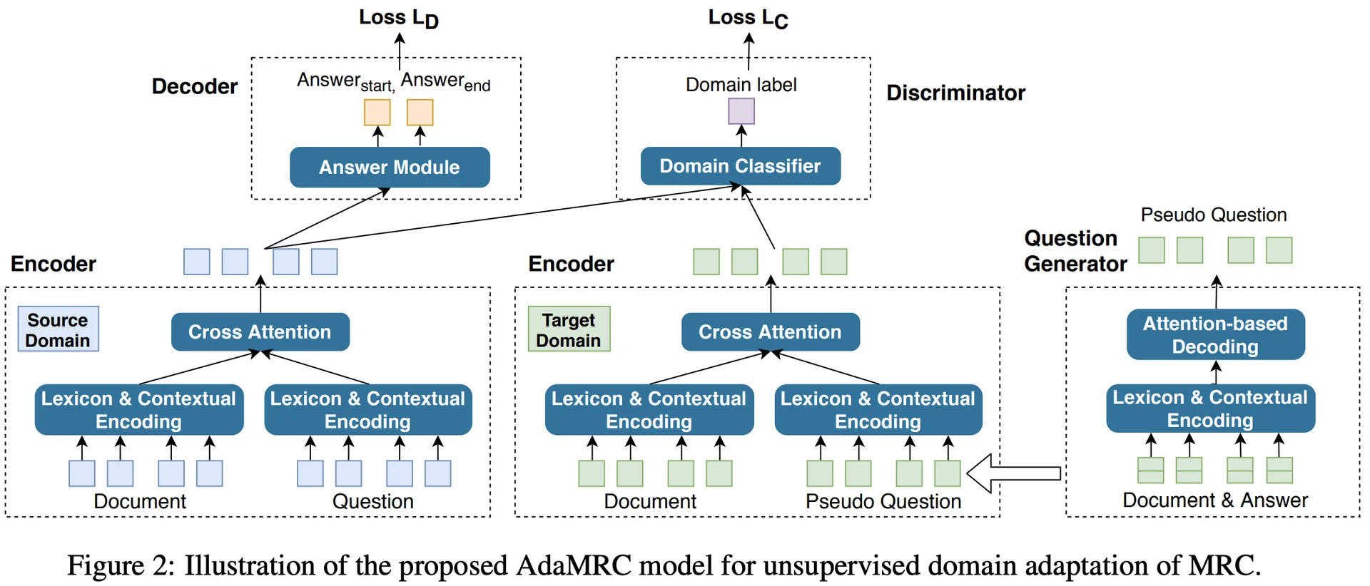 본 논문에서는 AdaMRC라는 domain adaptation을 위한 새로운 프레임워크를 제시합니다. 이 프레임워크는 크게 1) Question generator, 2) MRC module, 3) Domain classifier로 구성되어 있으며, 많은 양의 레이블 된 소스 도메인 데이터를 레이블이 없는 타겟 도메인 데이터로 adaptation하는 방법을 제시합니다.