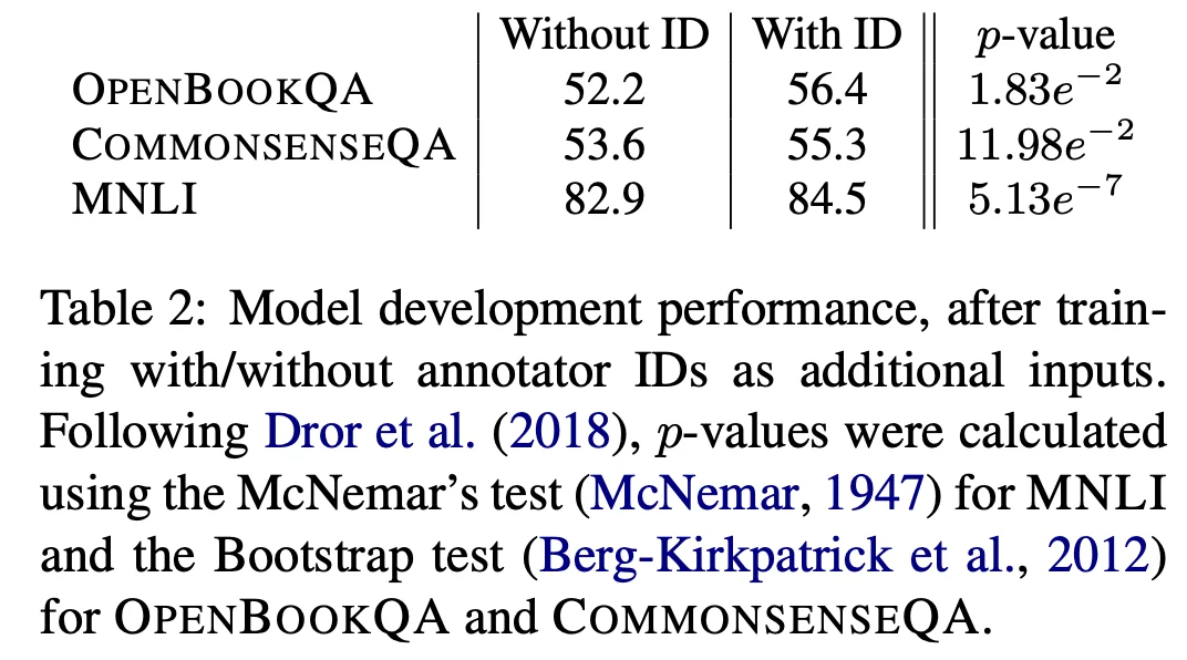 본 논문에서는 실험할 때 워커 ID를 feature로 넣으면 모델의 성능이 올라감을 보이고, 트레이닝셋에 기여하지 않은 워커가 만든 테스트 데이터에 대해서는 성능이 떨어짐을 보였습니다. 이를 통해 추론할 때, 워커에 따른 bias가 존재함을 확실하게 알 수 있습니다.