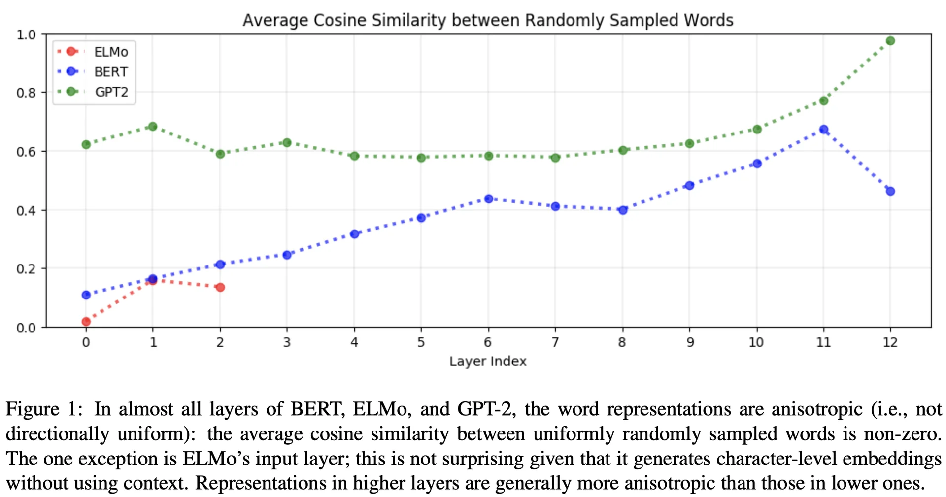 모든 레이어별로 동일한 contextuality를 보이지 않습니다. 이와 마찬가지로 각 모델별로 contextuality에 관여하는 레이어가 다릅니다. (ELMo는 상위, BERT는 중간, GPT는 하위 레이어에서 각각 더 많은 기여)