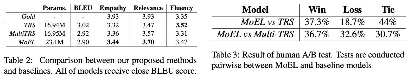 (결과) 성능 평가를 위해 competitive baseline들과 비교 테스트를 하였고, human evaluation도 하였습니다. SOTA를 찍었으며, 분석을 통해서 MoEL이 효과적으로 올바른 listener에 집중하고 있다는 걸 보였습니다. 또한 모델이 각 emotion에 어떻게 대응하는 게 알맞은 것인지 학습했습니다. 실험 결과를 통해 볼 때, 기존 연구에서 발전된 해석 가능한 생성 모델이라 생각합니다.