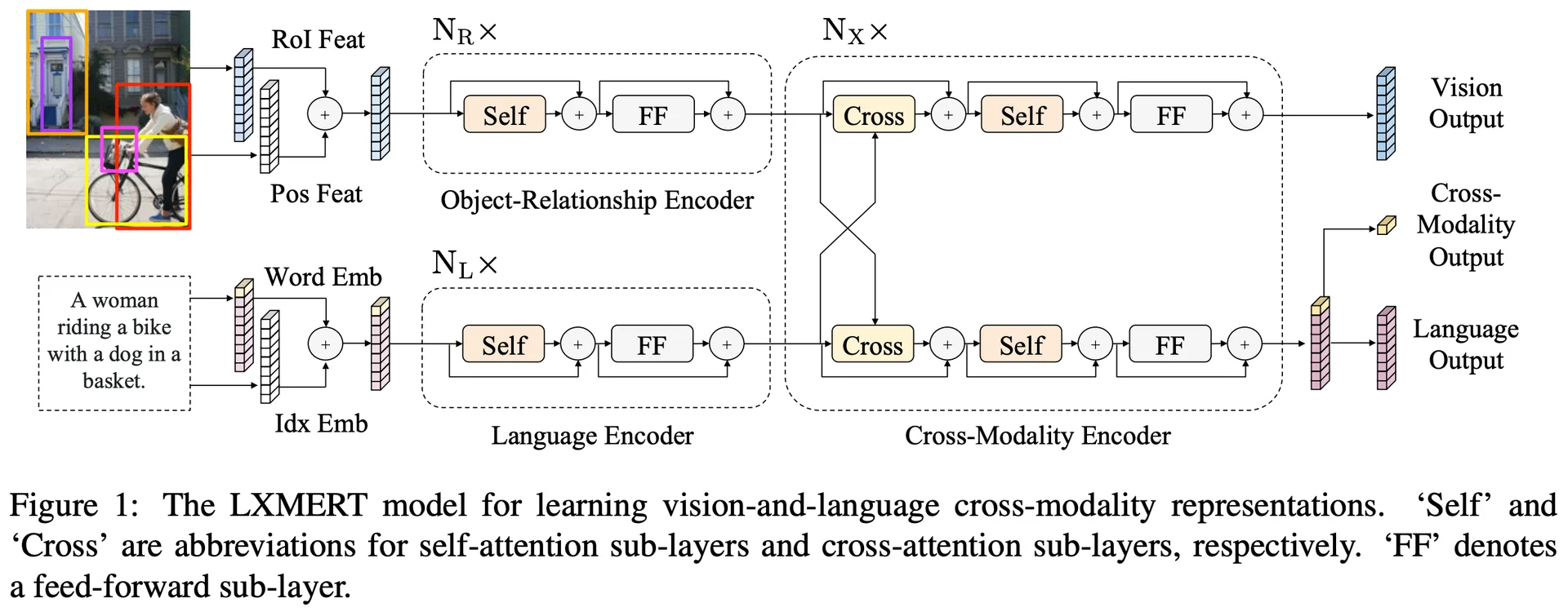 Cross-modality Encoder: vision → language, language → vision으로의 cross-attention + self attention으로 이루어진 Transformer encoder를 사용하였습니다.