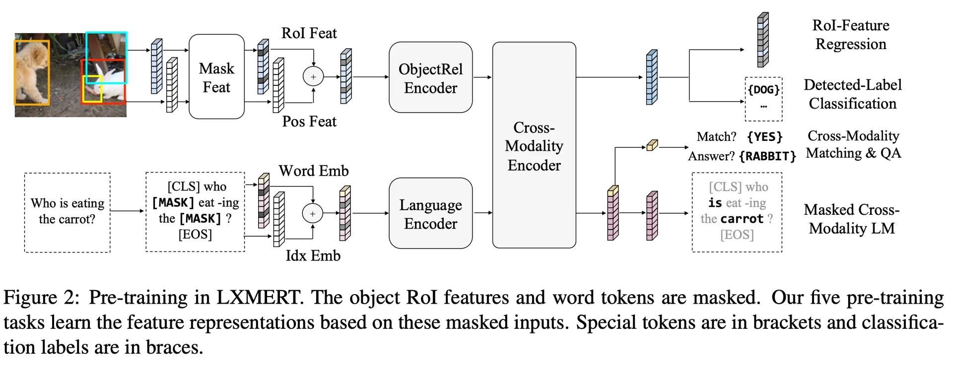 masked cross-modality language modeling: BERT와 비슷하게 입력 문장에 Masking을 하고 이를 맞추는 문제를 풀었습니다. (구조 상 시각 정보도 함께 이용하여 풀게 됩니다.)