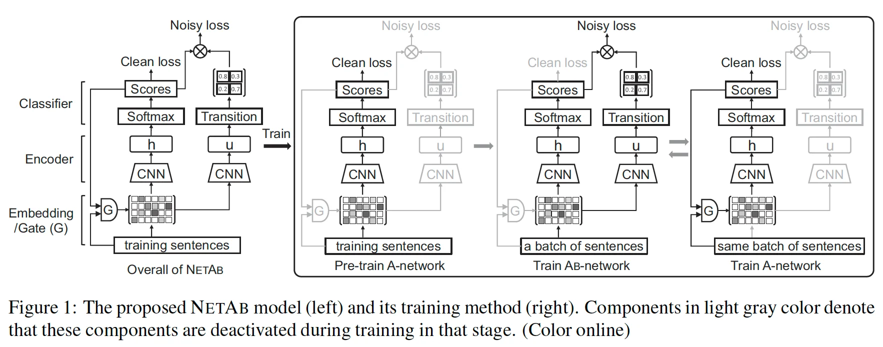 (어떻게?) 그림과 같이 2개의 CNN으로 구성된 모델 NET-AB를 제안했습니다. 총 2개의 CNN 모델로 이루어져 있어, 한 모델은 ‘clean’ label을 예측하는 sentiment score를 학습하는 모델 (A-network)이고, 다른 한 모델은 noise transition matrix를 추측하기 위한 모델(AB-network)입니다.
