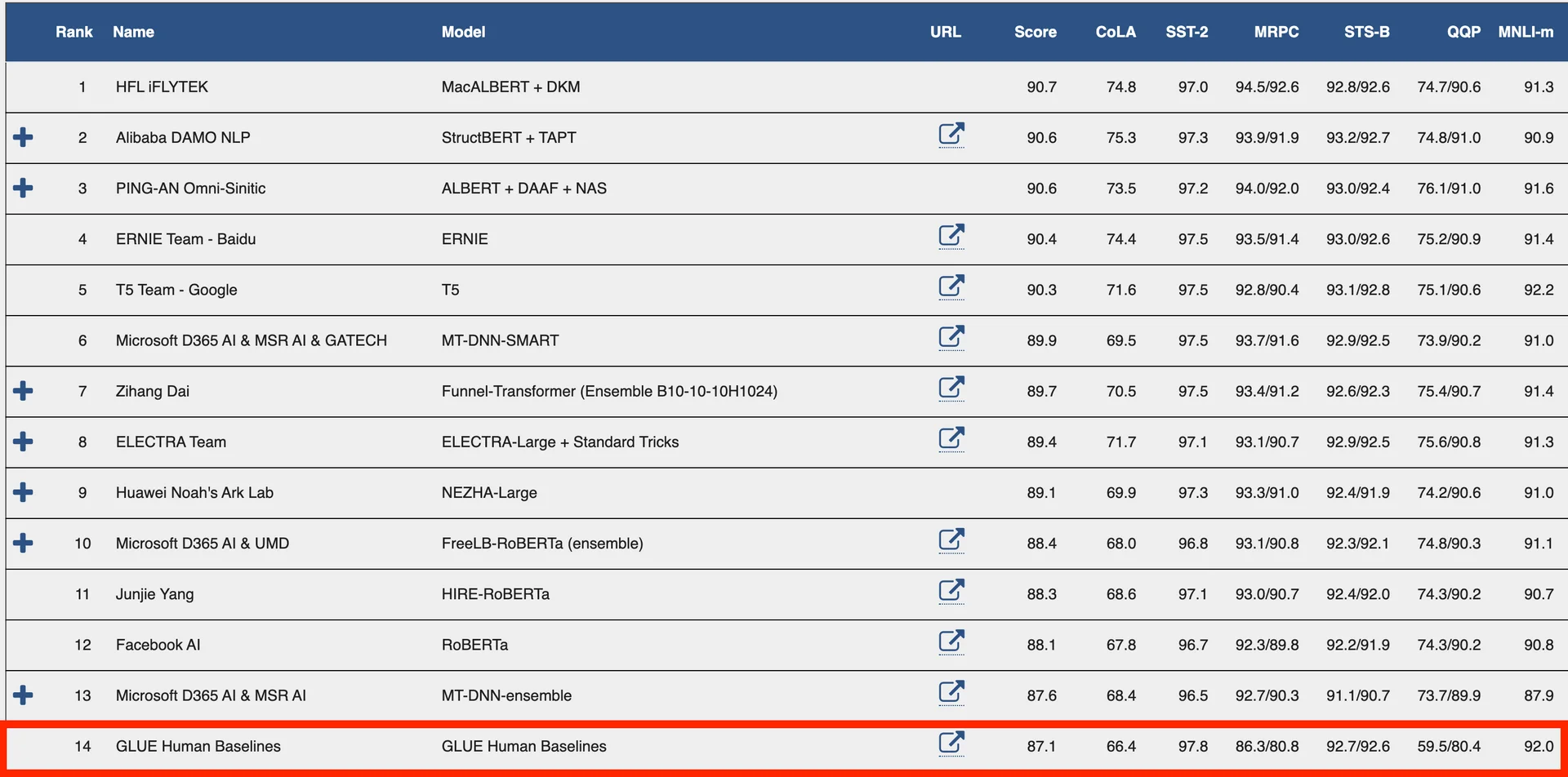 GLUE는 2018년에 뉴욕대, 워싱턴대, 딥마인드의 NLP 연구자들이 함께 만든 언어 벤치마크입니다. 언어 능력을 측정하는 9가지 테스트셋을 포함하고 있습니다. 예를 들어, 해당 문장이 문법적으로 맞는지 판단하는 CoLA, 두 문장의 의미가 유사한지 판단하는 STS-B, 두 문장의 논리적 상관관계를 판단하는 MNLI 같은 것이죠.