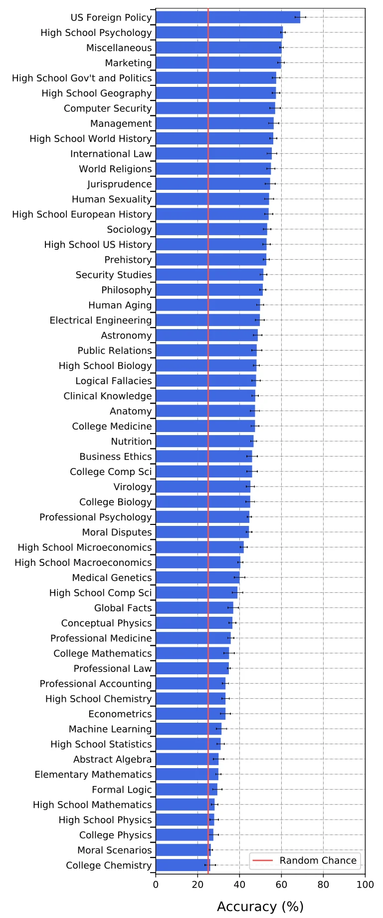 저자들은 의학부터 수학, 화학, 외교, 경제학, 철학 등등까지 무려 57개의 분야에서 15,908개의 문제를 준비했습니다. 이 중 14,080개의 문제가 테스트로 사용되었죠. 과연 GPT-3의 정답률은 얼마였을까요?