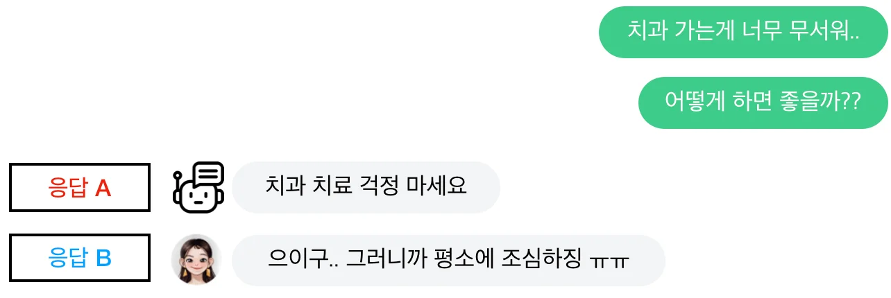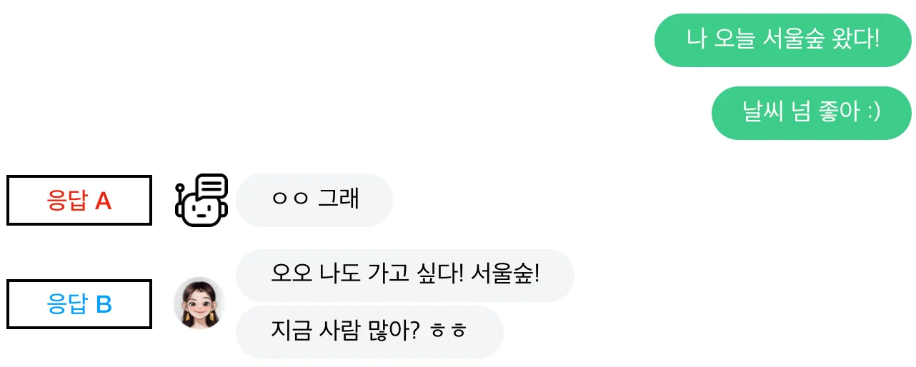 생성 모델을 단순하게 적용한 챗봇은 응답 A와 비슷한 문장을 생성하는 것을 선호합니다. 하지만 실제 사용자들은 응답 B와 같이 공감해 주는 표현을 더 선호하기 마련입니다.