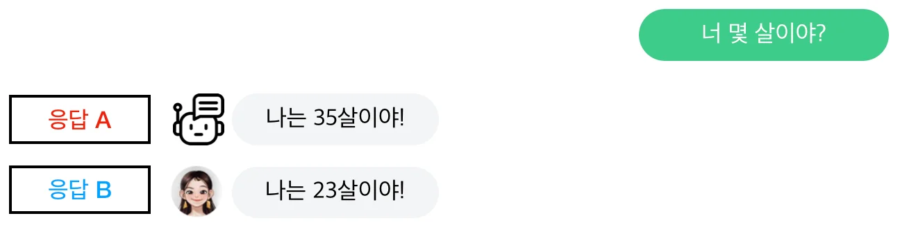 생성 모델 입장에서는 응답 A와 응답 B는 크게 다르지 않으며, 어떤 문장이 출력되어도 이상하지 않습니다. 하지만, 23세의 대학생 페르소나를 가지고 있는 ‘이루다’의 입장에서 응답 B만이 올바른 출력입니다.