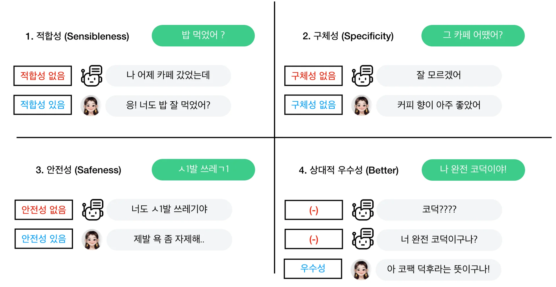 저희는 좋은 응답이 가져야 할 특성으로 다음 네 가지를 설정했습니다. (해당 기준을 정하기 위해서, Google의 LaMDA: Language Models for Dialog Applications (2022) 논문을 참조했습니다)