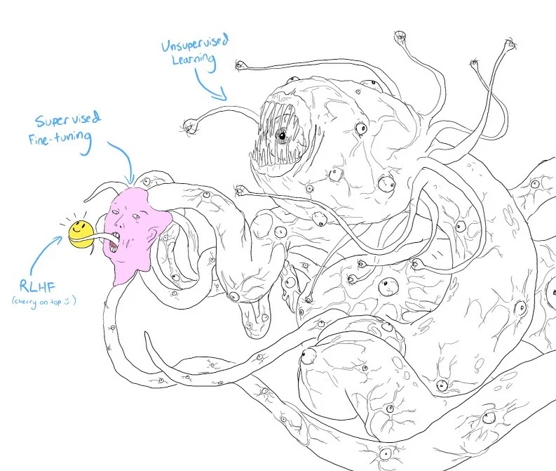 Unsupervised Learning (Pre-training): 사전 학습을 통해서 대형 생성 모델(PLM)을 만듭니다. 대형 생성 모델은 길들여지지 않은 괴물과 같이 거대하고 강력하지만 사람이 원하는 의도대로 동작하기 어려운 경우가 많기 때문에 서비스에 바로 적용하기에는 어렵습니다.