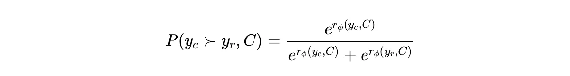 이렇게 구축한 리워드 모델 학습 데이터셋을 기반으로 리워드 모델을 학습합니다. 여기서 Bradley-Terry 모델이라는 두 후보의 우위에 대한 확률을 계산하는 확률 모델을 사용합니다. (C,yc,yr)(C,yc,yr)에 대해서 ycyc 답변이 yryr 답변보다 더 좋을 확률을 다음과 같이 계산합니다.