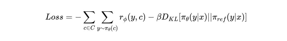 이제 리워드 모델을 학습했으니, 생성 모델에 대해 RLHF 학습을 할 준비가 끝났습니다. 먼저 RLHF 학습을 위해 별도로 준비한 대화 문맥 cc에 대해 SFT 모델이 답변 후보들 y1,…,yNy1,…,yN을 생성합니다. 그 후, 리워드 모델이 생성한 답변들에 대해서 리워드 점수 rϕ(y1,c),…,rϕ(yN,c)rϕ(y1,c),…,rϕ(yN,c)를 계산합니다. 이를 기반으로 다음 loss 함수와 같이 리워드 점수를 최대화 하는 방향으로 SFT 모델을 fine-tuning합니다.