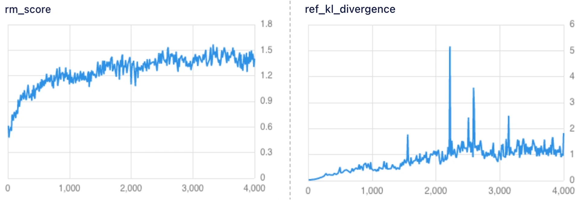 아래 오른쪽 그래프는 원래 레퍼런스 모델과의 KL Divergence 추이로, 중간에 몇 step을 제외하고는, 기존 생성 모델과 분포가 크게 벌어지지 않은 것을 확인할 수 있습니다. KL Divergence 추이를 보면서, 모델의 학습이 어느 정도 진행되었는지를 파악할 수 있었습니다.
