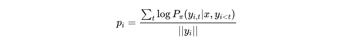 RRHF: Rank Responses to Align Language Models with Human Feedback without tears 논문 [11]에서 제안한 방법으로, 리워드 모델이 매긴 점수와 각 답변의 문장 확률 정보를 기반으로 학습을 진행합니다. 구체적으로는, 각 문맥 별로 kk개의 답변 샘플을 생성합니다. 이 샘플은 사람이 생성할 수도 있고 GPT-4와 ChatGPT와 같은 성능 좋은 LLM 모델 또는 SFT 모델이 생성할 수도 있습니다. 그리고 각 답변에 대해서, 학습하는 생성 모델이 문장의 확률을 다음과 같이 계산합니다.