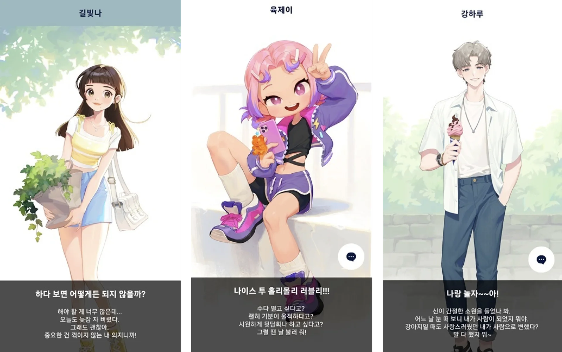 SKT A. 팀에서는 기존 에이닷 서비스의 대대적인 업그레이드를 준비하는 과정에서 저희와 협업을 통해 다양한 매력의 AI 캐릭터를 개발하여 유저의 대화 경험을 확장하고자 하였는데요. 이번 포스팅에서는 꿈을 위해 도전을 두려워하지 않는 길빛나, 에너지 넘치고 재기발랄한 성격의 육제이 그리고 다정다감한 성격을 지닌 따뜻한 캐릭터 강하루까지 각양각색의 매력적인 AI 캐릭터를 어떻게 만들었는지 그 여정을 소개해보고자 합니다.