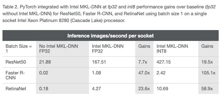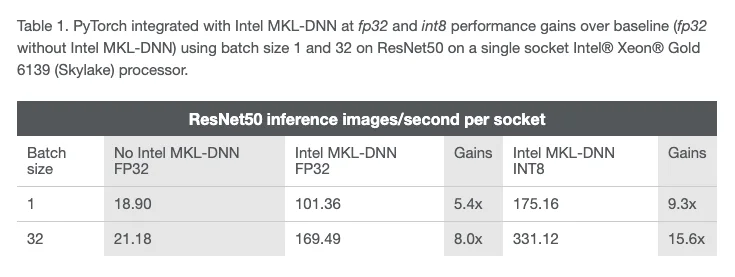 사용하는 환경에 따라 차이가 있을 수 있으나 Intel의 자료를 참고하여 살펴보면, PyTorch에서 MKL-DNN 지원 유무에 따라 매우 큰 차이를 보인다는 것을 확인하실 수 있습니다.