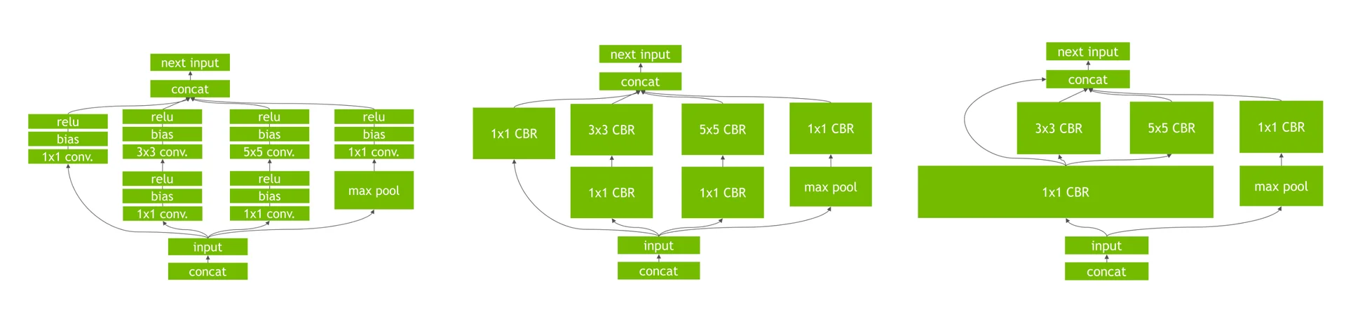 아래 왼쪽의 그림과 같은 CNN 구조에서 Convolution, Bias and ReLU Layer를 하나로 합쳐서 CBR Layer로 만들고, 다시 이를 통합해서 연산을 더 효율적으로 처리하는 구조로 바꿀 수 있습니다.
