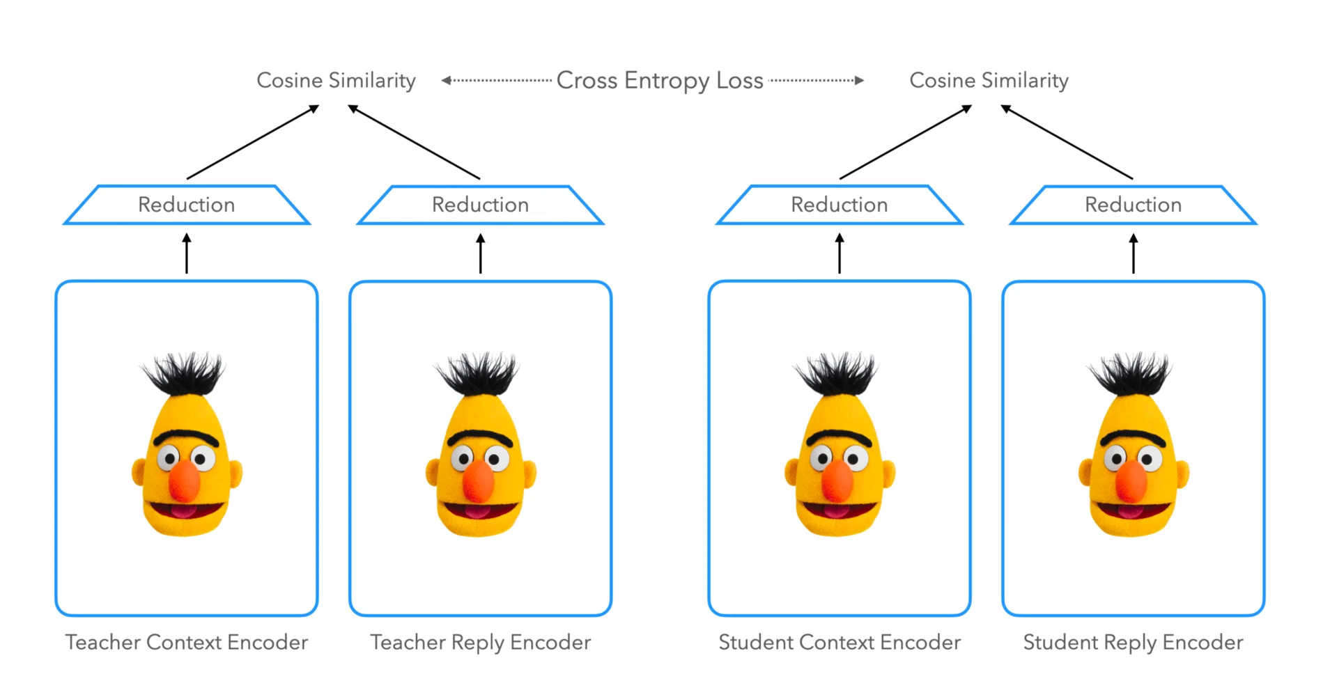 Teacher 모델은 대화 문맥과 답변을 각각 인코딩하기 위해 두개의 BERT 인코더로 이루어진 모델입니다. 그 뒤 Faiss와 같은 라이브러리를 사용하여 ANN (Approximate Nearest Neighbor) 검색을 쉽게 하기 위해 BERT의 Hidden Size에서 고정된 차원으로 Projection하는 Feed Forward 레이어가 각각 BERT 인코더 뒤에 하나씩 존재합니다. 대화 문맥과 답변이 잘 맞는지는 각 Encoder의 결괏값 사이의 코사인 유사도를 기준으로 확인합니다.