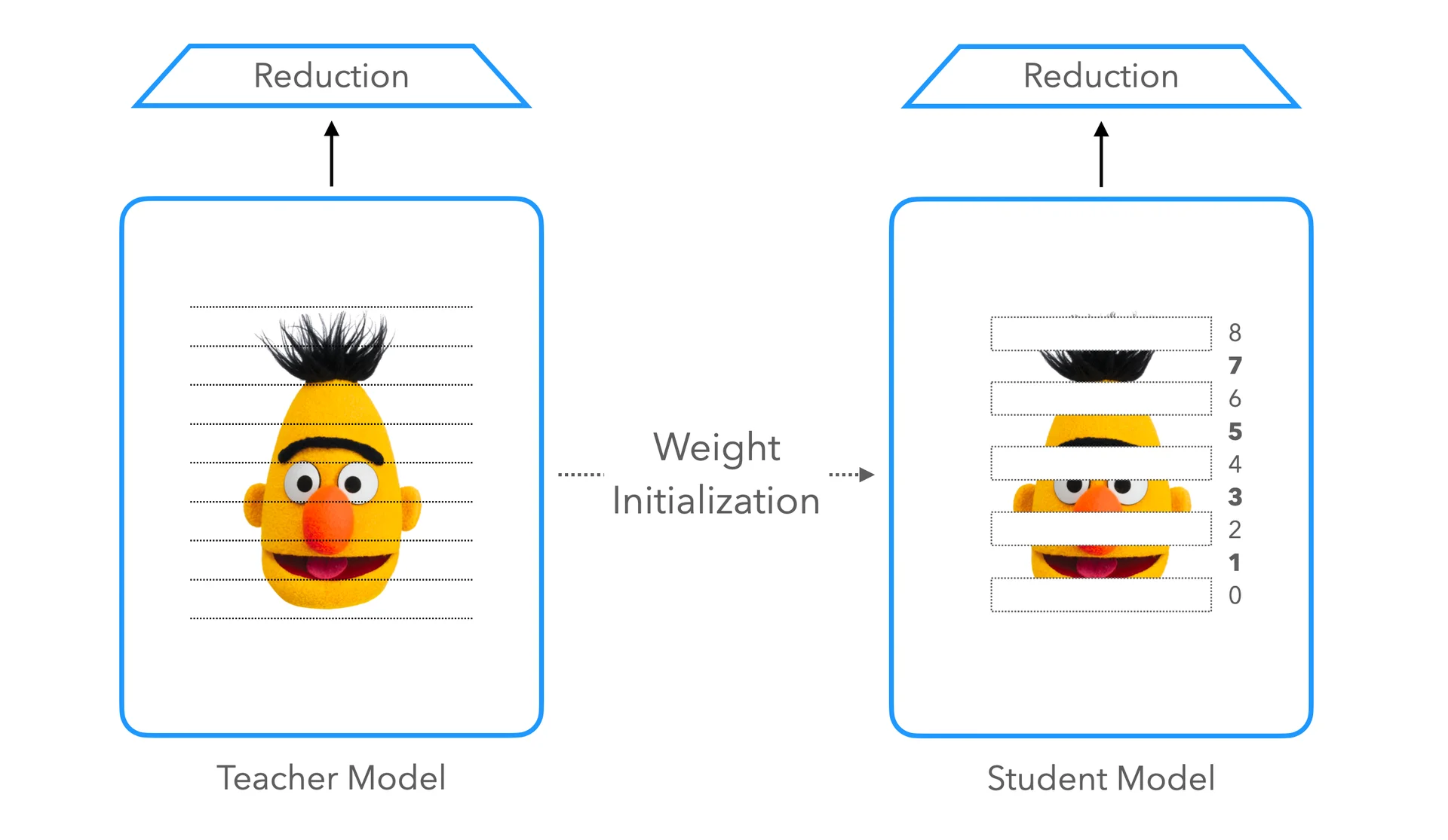 첫 번째 방식으로는 트랜스포머 레이어의 크기를 줄일 수 없습니다. 다만 Teacher 모델의 트랜스포머 레이어를 일정 부분 취하여 모델을 구성함으로써 상대적으로 적은 실험을 통해 예측 가능한 속도와 성능을 안정적으로 뽑아낸다는 것이 장점입니다. 예를 들어 8 레이어를 사용하는 Student를 만들기로 결정하였다면 24 레이어의 Teacher에 대비하여 약 3배에 가까운 추론 속도 향상을 불러옵니다.