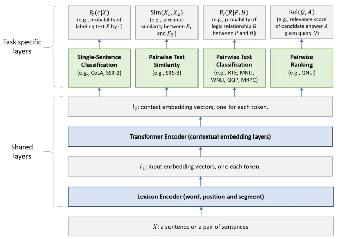 위에서 계속해서 시사되고 있는 바는 “BERT는 매우 강력한 모델이며, 이를 이끌어내기 위해서는 더 어려운 문제가 필요하다.” 라는 것입니다. 이에 대해서 자연스럽게 내릴 수 있는 가설은 “다양한 작업으로 학습시키면 언어를 잘 이해할 수 있지 않을까?” 입니다. MT-DNN은 이 가설을 실제로 시험해본 모델이라 할 수 있습니다.