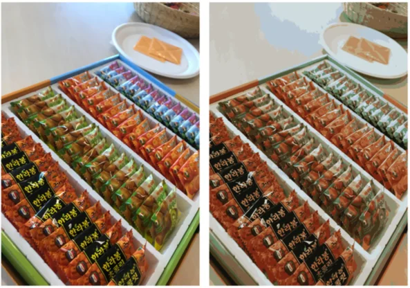 양자화(Quantization)라고 불리는 기법은 원래 연속된 아날로그값을 불연속적인 디지털값으로 변환하는 것을 말하며, 정해진 단위값으로 근사시켜서 통일시키는 것을 일컫습니다. 양자화를 하게 되면 (얼마나 정밀하게 하느냐에 따라 다르겠지만) 필연적으로 정보가 손실됩니다. 즉, 데이터의 정밀도가 떨어지게 됩니다. 하지만 반대로 압축률이 올라갑니다. 즉, 더 적은 용량으로도 데이터를 나타낼 수 있게 됩니다. 대부분의 경우 신호의 정밀도는 큰 문제가 되지 않습니다. 왜냐하면 통상 데이터는 주요 대표값에 의해서 기술되기 때문입니다. 밑의 과자 사진에서 왼쪽은 24bit (1677만 색) 이미지이고 오른쪽은 불과 4bit (16색)이미지입니다. 수치적인 정밀도는 비교할 수 없이 줄었지만, 사진의 이미지가 꽤 잘 보존된 것을 확인할 수 있습니다.
