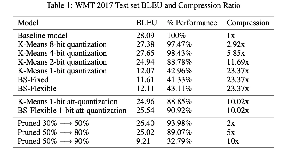 스탠포드의 Robin Cheong과 Robel Daniel은 Transformer 구조에 대해서 간단한 K-means Quantization과 Threshold 미만 가중치 쳐내기를 적용했을 때, 성능이 어떻게 변하는지 확인하였습니다. 실험은 WMT 2017 데이터셋에 대해 진행되었고, BLEU를 측정하였습니다. 양자화 방법의 경우, K-means (데이터 클러스터링 시에 상위 K개의 피벗값으로 대표화하는 방법), Binary Masking (Threshold 미만의 데이터값을 0으로 치환하는 방법으로 Threshold 고정(BS-Fixed) 과 변동(BS-Flexible)이 있음)을 적용하였습니다.