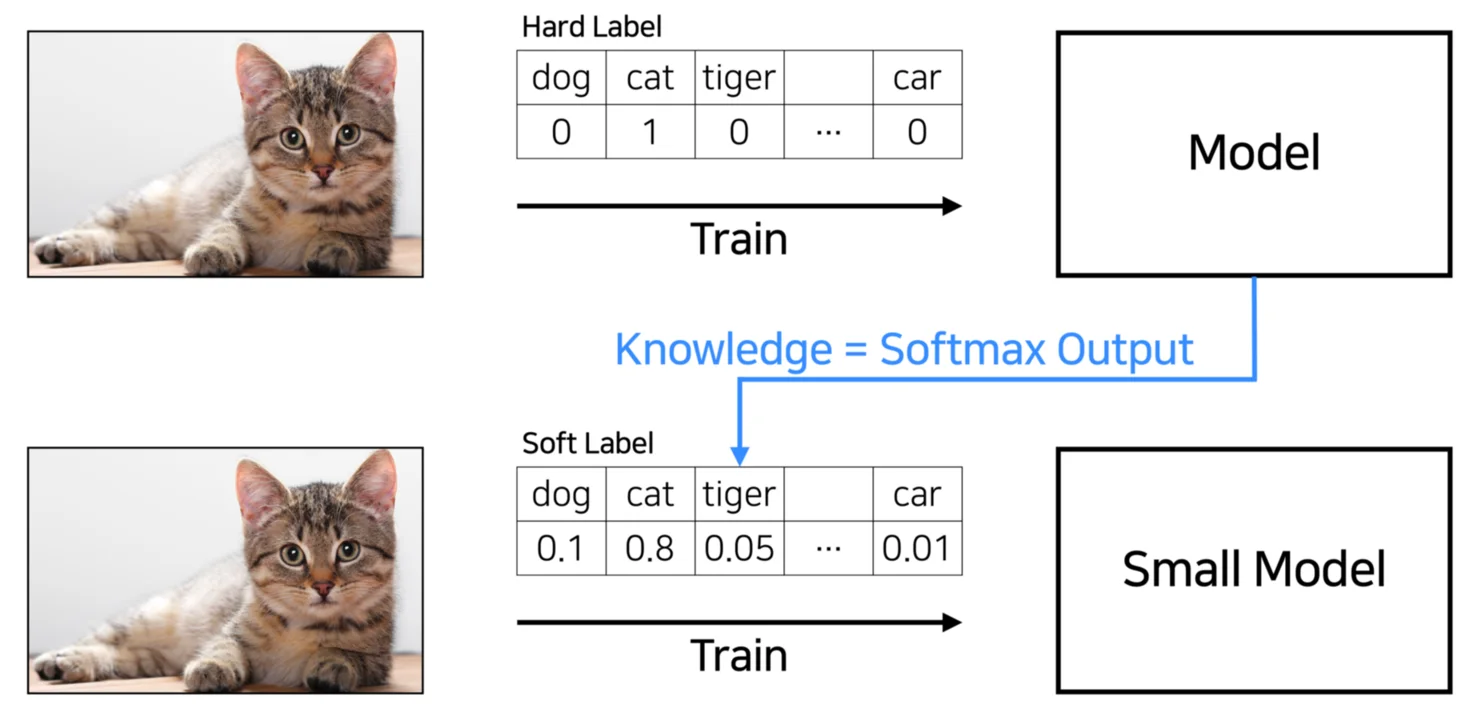 예를 들어 분류 문제를 푸는 상황을 가정해봅시다. 원래 데이터는 그 이미지가 어떤 물체에 해당하는지에 대한 정답 라벨(Hard Label)이 달려있을 것입니다. 이 이미지를 잘 훈련시킨 모델(선생 모델)에 전달하게 되면, 대부분 결과도 그 정답과 일치할 것입니다. 한 가지 놀라운 사실은, 모델이 만들어낸 결과 분포가 실제 이미지를 더 풍부하게 표현한다는 것입니다. 즉, 원래 정답 관점에서는 정답 이외에 대한 정보가 없지만, 한번 모델에서 풀어나온 결과는 정답 외에도 다른 물체에 대한 정보를 담고 있게 됩니다. 이렇게 정보가 묻어 나오는 것이 마치 석유의 부산물들이 증류탑에서 나오는 양상과 같기 때문에 이를 지식 증류라고 일컫습니다.