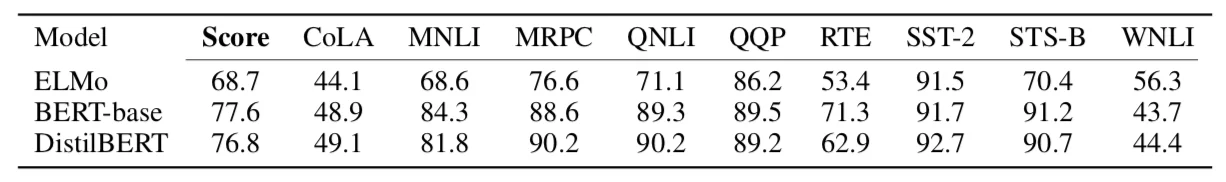 실험 결과, 파라미터 수가 절반임에도 불구하고 원 BERT의 성능과 대등한 성능을 보였으며, 심지어 CoLA, SST-2 등 몇몇 작업에 대해서는 더 우수한 성능을 보였습니다. 즉, Pretrain 단계에서 BERT 모델의 출력은 해당 단어에 대한 언어 모델 그 이상의 정보를 가지고 있다는 것을 시사합니다.