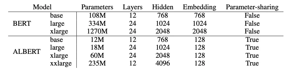 ALBERT는 구글과 토요타 연구소에서 새로 제시된 모델입니다. 기존의 BERT와 BERT x-large 모델은 성능은 좋았지만 너무 모델 크기가 크다는 문제가 있었습니다. 실험 결과, BERT x-large (모델 사이즈: 1270M)의 경우 RACE 데이터에 대해서 더 작은 모델인 BERT보다 더 낮은 성능을 보였습니다. 따라서 본 논문의 저자들은 모델 가중치의 효율적인 재활용과 더 어려운 문제를 도입함으로써 조금 더 충실한 구조를 만들고자 하였습니다.
