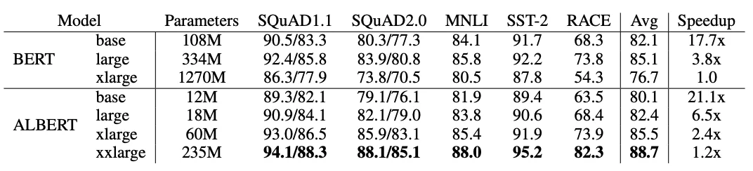 ALBERT는 더 적은 수의 파라미터를 사용하는 경우에도 빠르고 우수한 성능을 보여줍니다. 특히 기존의 BERT가 단순히 XLarge 형태로 파라미터를 늘렸을 때 성능이 하락한 것과 다르게 ALBERT의 XLarge 모델은 파라미터 크기에 따라 성능이 상승하는 것을 볼 수 있었습니다. 이는 ALBERT가 잉여 파라미터가 BERT에 비해 더 적고 전체 모델이 훨씬 효율적으로 훈련됨을 의미합니다.