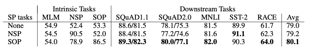 아울러 문장간 순서 맞히기 (SOP)가 다음 문장 맞히기 (NSP)에 비해 더 우수한 성능을 나타내는 것으로 보였습니다. 상술한 논문들에서 시사되었던 바와 같이 NSP는 (1) 언어의 미묘한 특성을 잘 반영하지 못하고 유사한 단어에 편향되어 있고 (2) 단어에 대한 정보는 이미 LM에서 잘 학습되었기 때문으로 보입니다.