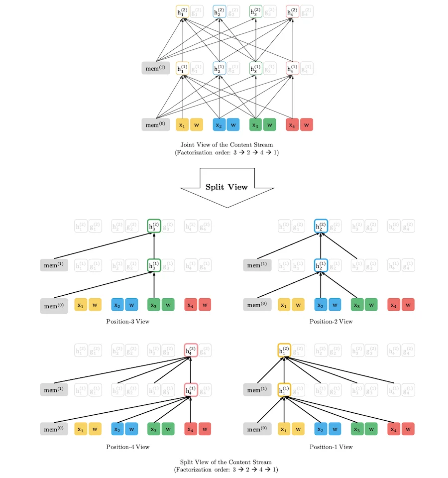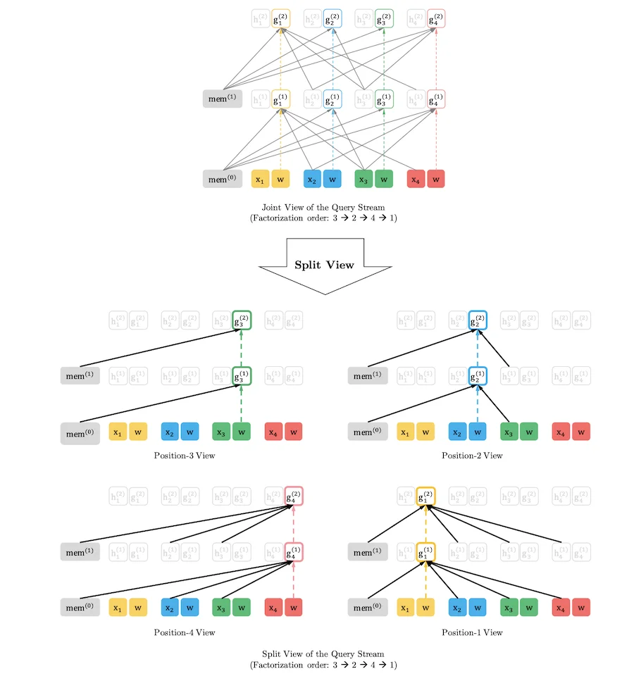 이때 [.,.][.,.]은 concatenation을 의미합니다. 식에서 알 수 있듯이 한번 ~h(m)h~(m) 를 이전 segment 처리에서 계산하고 나면 ~zz~ 와 독립적으로 현재 segment (zz)에 대한 attention update 계산이 이루어집니다. 이를 통해 과거 segment에 대한 factorization order를 고려하지 않고 memory의 caching과 reusing이 가능한 것입니다. Query stream (g(m)ztgzt(m)) 대해서도 같은 방법으로 계산할 수 있습니다.