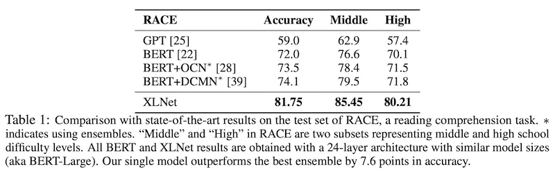 RACE dataset 100K 개의 중국 중/고등학생을 위한 질문과 전문가들이 단 정답으로 이루어져 있습니다. Reasoning에 대한 질문을 포함하는 가장 어려운 QA dataset 중 하나입니다. 게다가 평균 passage의 길이가 300을 넘고 이는 유명한 QA dataset인 SQuAD보다 깁니다. 따라서 RACE dataset은 긴 문장의 이해에 대한 척도가 될 수 있습니다. XLNet을 Sequence length를 640으로 fine-tuning 시켰으며, GPT와 BERT를 큰 격차로 outperform 하였습니다. 아무래도 dataset 자체가 전반적으로 길다보니 좀 더 큰 차이가 생기지 않았나 싶습니다.