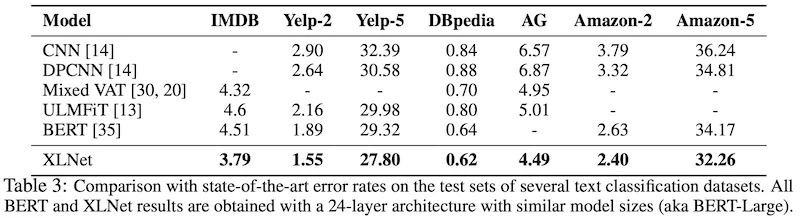 Text Classification 테스크에서 유명한 dataset에 대해서 실험을 진행하였습니다. BERT와 비교하여 IMDB, Yelp-2, Yelp-5, Amazon-2, Amazon-5에서 각각 16%, 18%, 5%, 9%, 5%의 error rate에 대한 감소를 보였습니다.