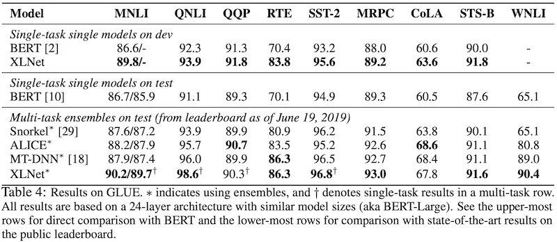 하지만 짧은 문장을 다루는 테스크에서는 XLNet이나 Transformer-XL가 가지는 긴 문장에 대한 이점을 충분히 활용할 수 없기 때문에, RACE나 SQuAD 만큼 dramatic한 성능 향상을 기대하긴 어려울 것 같습니다.