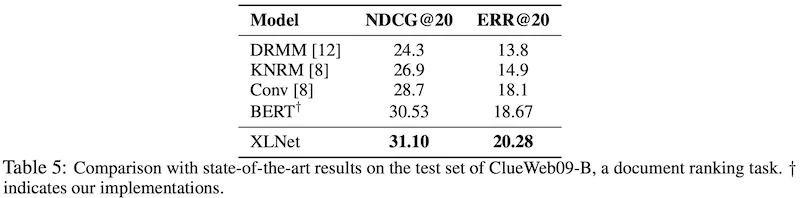 ClueWeb09-B dataset을 이용해 Document ranking에 대한 성능을 평가하였습니다. Query는 50M의 documents를 기반으로한 TREC 2009-2012 Web Tracks에 의해서 만들어졌고, 검색 결과인 top 100의 document를 reranking하는 테스크입니다. Document ranking 문제 같은 경우 주로 low-level representation이 효과를 보고 있기에 이 dataset은 XLNet word embedding의 질을 평가하는 용도로 사용하였습니다. Document와 query에 대해 fine-tuning 없이 XLNet의 word embedding을 추출하였으며, kernel pooling network (Xiong et al., 2017) 를 통해 document ranking을 하였습니다. 이 또한 기존 state-of-the-art 모델들을 outperform 하였습니다.