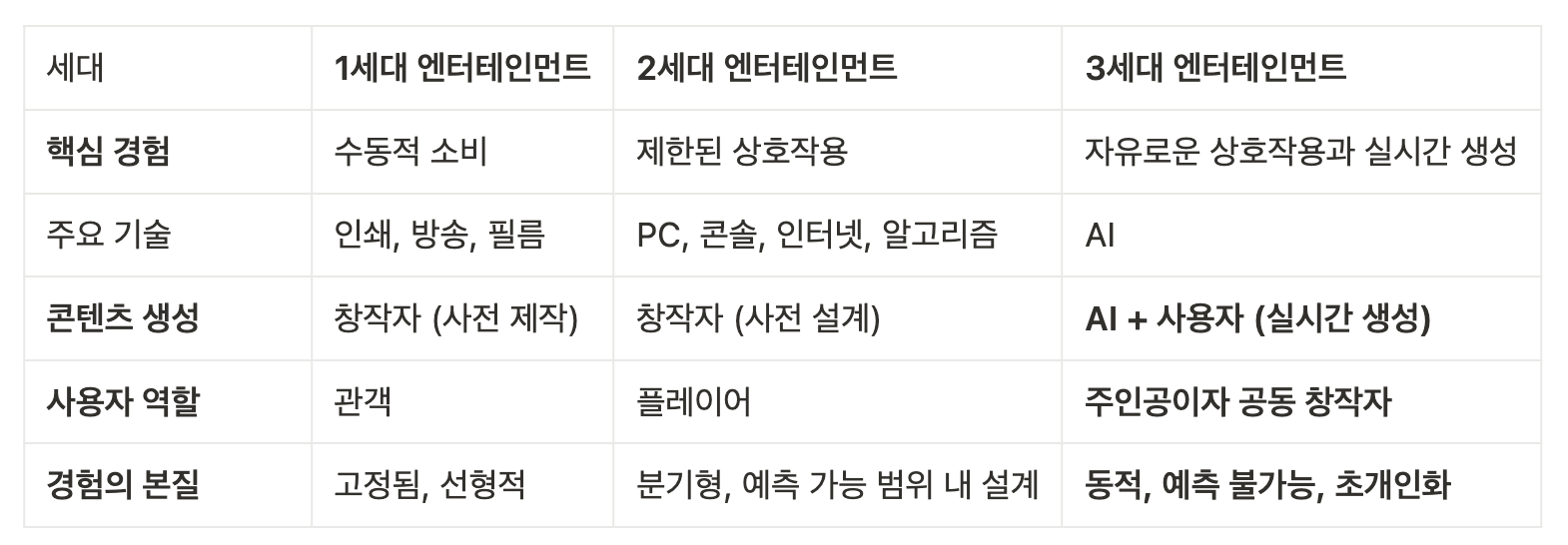 엔터테인먼트의 역사를 되짚어보면, 인쇄/방송 기술 기반의 1세대 엔터테인먼트는 창작자가 만든 콘텐츠를 수동적으로 소비하는 형태였습니다 (소설, 영화, TV 등). 디지털/인터넷 기술 기반의 2세대 엔터테인먼트는 기획자가 만들어놓은 틀 안에서 사용자가 제한된 상호작용을 하는 시대였습니다(게임). 하지만 두 시대 모두, 사용자 경험은 창작자가 미리 설계한 틀 안에 머물 수밖에 없었습니다.